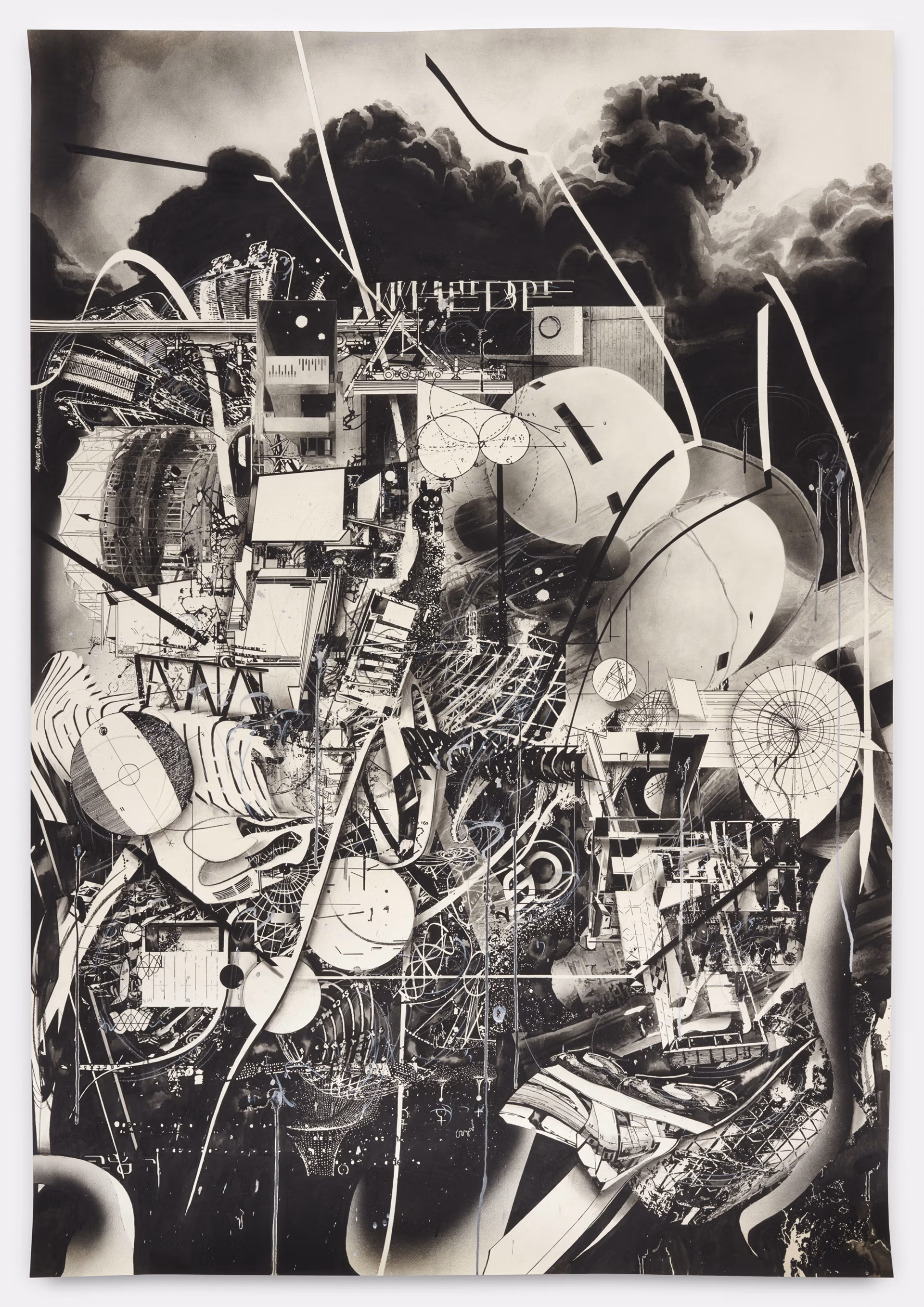 Growing up in the countryside on the island of Shikoku, the Japanese artist Hiroki Tsukuda often imagined travelling to hidden realms beyond our world. Encounters with the most ordinary objects in everyday life would inspire him to conjure up fantastical scenarios in alternate realities. Today, he creates meticulous collages that evoke surreal, futuristic worlds inspired by science-fiction films, video games, comics and music. He often blends fragments of urban and natural environments with geometric shapes and speculative architectural forms. Tsukuda’s process begins by combining his photography with images gathered online to create complex compositions using computer software. He then uses ink and charcoal to draw intricately layered scenes. As part of Spotlight, a new curatorial initiative in the Galleries sector, Galerie Gisela Capitain will present his mixed-media works, including works on paper and sculpture.