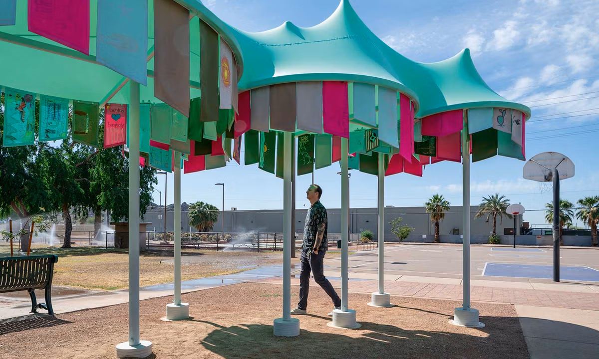 Among the projects using heat-mitigating materials is an installation by the New York-based artist and landscape architect Jessica Arias called Reflections on Sunnyslope. The raised, tent-like shades were made with UV-resistant canvas and heat-reducing paints, their shapes mirroring the peaks of the Sunnyslope Mountain in the distance. Hanging from the shade are drawings made by local residents.