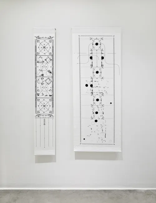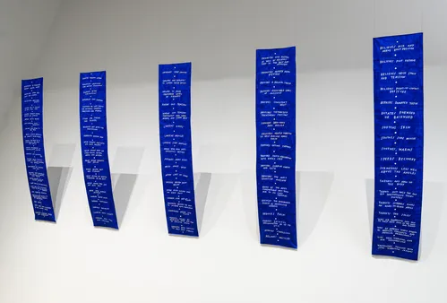 Part of the Shaker ethos was also to live and make their tools communally. This collective production method is critical in Kameelah Janan Rasheed’s two embroidered and printed sateen banners (both 2025–26). For these works, she collaborated with a local embroiderer (Philadelphia’s only remaining silk-producing factory) and personally spent over 100 hours weaving with a group of artisans. Each banner stretches vertically (around 160 inches up the wall) and presents abstracted interpretations of the handwritten journal of Rebecca Cox Jackson, who ran the only Black-led Shakers community, in Philadelphia.