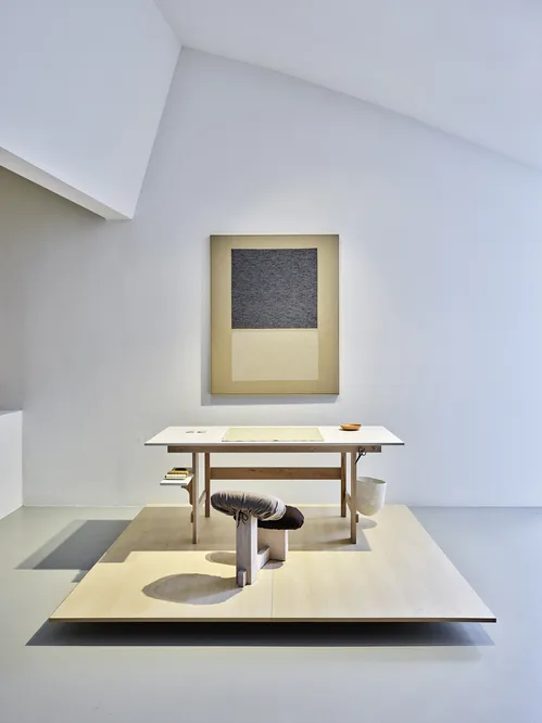 Elsewhere, Chris Liljenberg Halstrøm’s linen and cotton woven painting Meetinghouse (2025) refers to the believers’ communal worship houses, famously devoid of any decoration. The abstract tapestry anchors an installation entitled My Work Station / My Prayer Room (2025) that includes the artist’s wooden worktable finished with various tools and a cotton kneeling chair. The Scandinavian artist and furniture maker lifts the curtain on her long hours with thread by transporting her laborious process into the gallery. “The work becoming a prayer itself resonates with me,” said Halstrøm, “because as artists, we make things to respond to the world and the process is important.”