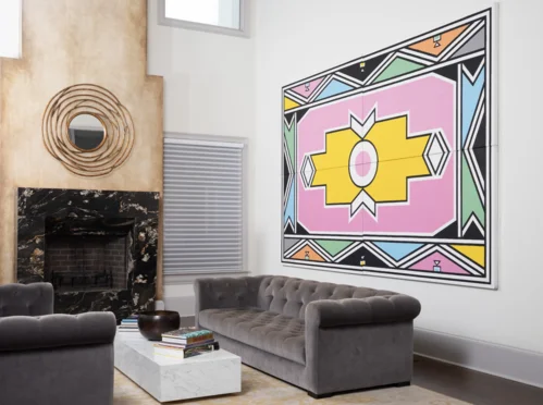 Because living with the art is central to Smith’s philosophy, it feels especially fitting that South African artist Esther Mahlangu’s massive, four-panel geometric painting Untitled (2024) hangs in the living room. Smith is among the artist’s most vocal advocates and owns 30 of her works. What drew him in, beyond the work’s “vibrancy,” was its connection to Mahlangu’s ancestry. “The history of where that practice comes from was astounding to me,” he said.