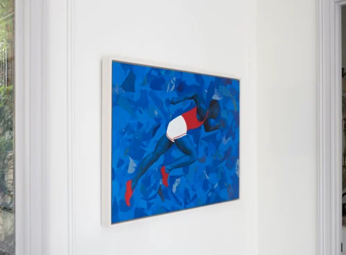 Before he considered acquiring a work, he wanted to make a personal connection. They clicked immediately. Today, two of Eugene’s works live in Smith’s house: a portrait in the living room and a giant commission, Untitled (2024), in the collector’s sunroom, an airy, gallery-like space where Smith hosts parties and fundraisers.