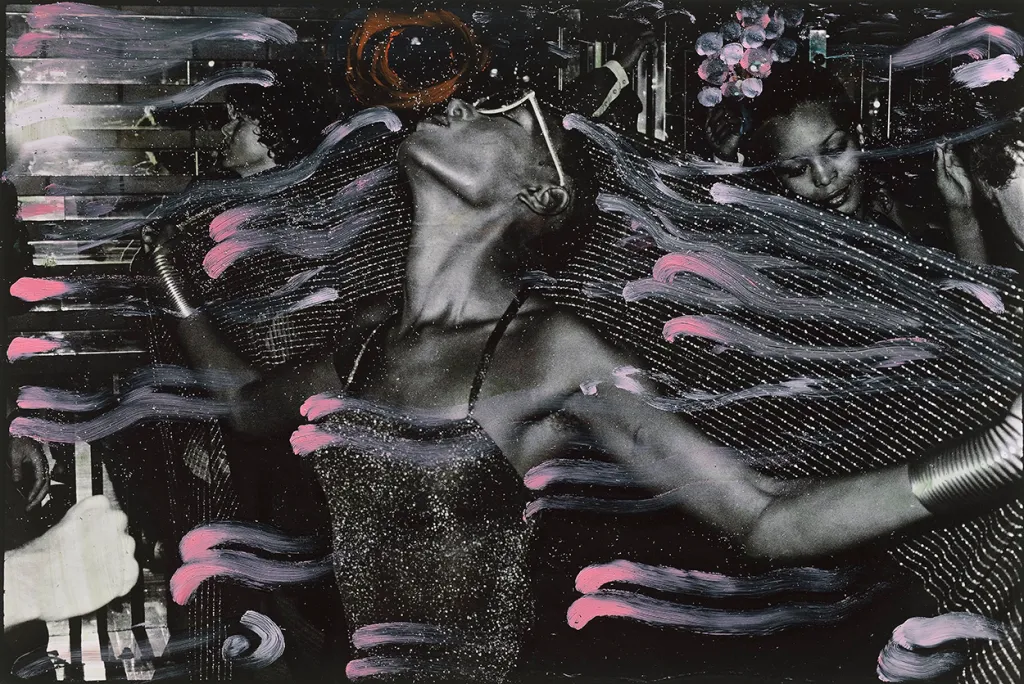 An incredible tactile energy comes from Smith’s pink brushstrokes, their bright hue and palpable texture adding a multisensorial element to the photograph, elevating it to another realm. These squiggly lines enhance the sense of Jones’s corporeal movement, as they seem to emanate from her electrifying presence. Their “material surplus,” to use Rizvana Bradley’s language, is evident in the visible marks left by the paintbrush as it moved across the photograph’s surface and in the warm intensity of the hot pink itself.21 This effulgent shade also appears in Lopez’s Ribbon Series. Smith’s painterly sensibility imbues the photograph with a startling haptic quality; it calls us to see and touch it.22 In this sense, its visceral hapticity gestures to the painted photograph’s excess, how it spills out of the bounds of one sense and into another. This seems appropriate for the times, considering how the prototypical 1970s disco was repeatedly described as a venue that engaged multiple senses simultaneously. For instance, Roland Barthes visited the Parisian disco Le Palace in the spring of 1978, the same year as Smith’s photograph. He marveled at its fantastic unison of “pleasures ordinarily dispersed,” including dance, music, and “the exploration of new visual sensations, due to new technologies”—an insight easily applicable to Studio 54.23 Barthes’s musing could also apply to Smith’s artistic proficiency here. Her textured hot pink paint jars us out of passive spectatorship, using color to invite us into this elusive but sharply rendered world: aural ecstasy, chromatic excess, and hap- tic pleasure.