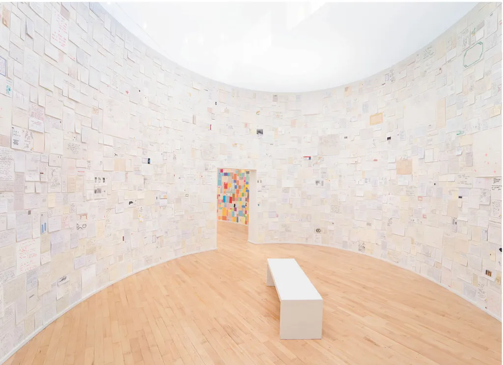 For 30 years, Grigely has turned his archive into artworks. His first note-based Conversation Piece premiered at White Columns in New York in 1994, and more recently, he arranged about 20,000 notes for a work called White Noise (2023). In this installation, two ovular rooms form an infinity shape. In one room, the walls are plastered with notes on white paper. The other boasts a radiant rainbow of scrap sheets dominated by a Post-it palette. The titular auditory term, “white noise,” draws its analogy from color theory, describing simultaneous sounds that cannot be parsed into distinct decibels just as white light contains the full spectrum of hues.