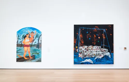 In addition, Angel Otero addresses the effects of climate change on Latinx communities in the large-scale painting Constellation (2024), which shows his grandmother’s couch suspended on a swing set and submerged in waves. The piece critiques the United States’s response to the widely destructive Hurricane Maria and the “ways in which memories and cultural heritage can be washed away by natural disasters,” Alvarez said.