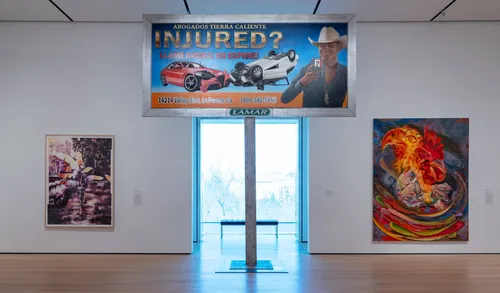 Alfonso Gonzalez Jr, a self-taught artist who previously worked as a commercial billboard painter, presents the striking Abogados Tierra Caliente (Billboard) (2024), a work mounted on a steel post in the style of a billboard. It reflects ads he saw in East Los Angeles for service providers like insurance companies and injury lawyers that very blatantly conveyed Latinx tropes and targeted Latinx communities.