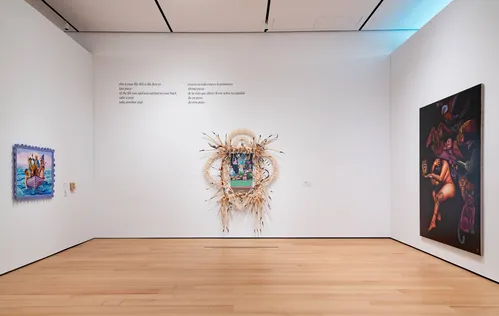In line with Alvarez’s expansive curatorial approach, some of the included artworks are not paintings at all. Some reimagine folk and craft traditions, like Justin Favela’s St. Maarten (1972), After Marisol (2025–26), a mural made with the colored tissue paper often used to make piñatas. The piece references a seascape by the Venezuelan American artist Marisol, who features prominently in the museum’s collection. It continues Favela’s decades-long exploration of the piñata style, which he began as a student in protest of his professors urging him to make work about his Mexican Guatemalan heritage.
