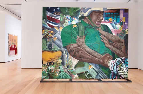 The show features 58 artists who approach painting as a flexible language. Some challenge the boundaries of the medium through unexpected materials, while others take distinct approaches to European traditions like landscape, portraiture, and still life. The exhibition will travel to the Des Moines Art Center, the Museum of Contemporary Art Denver, the Phoenix Art Museum, and the Frye Art Museum in Seattle.