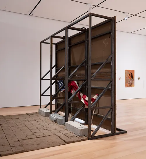 rafa esparza’s monumental Tratos (2025–26), commissioned specifically for the exhibition, is a six-panel painting on adobe blocks that is supported by a steel armature. On the back, the artist has created an assemblage that partly comprises a mangled American flag and laid adobe blocks on the floor.