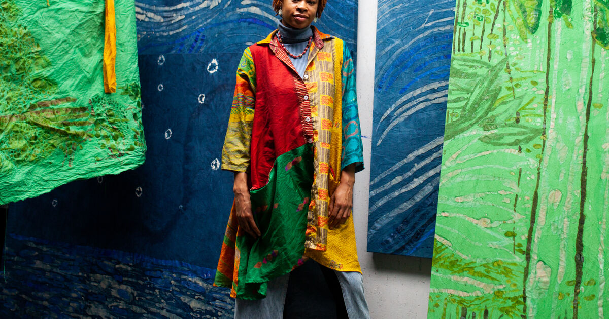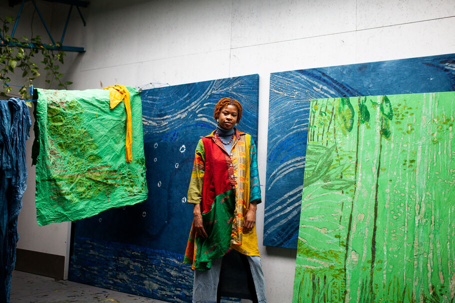 British-born and London-based Nigerian artist Sola Olulode, for example, says she has been eager to exhibit in ART X Lagos for years, having incorporated the country’s traditional textile practices into her work since 2017. Like many of her recent pieces, Olulode’s works presented by Wunika Mukan Gallery at ART X Lagos this year drew from adire, a textile-dyeing technique from southwestern Nigeria that uses tying, stitching, and painting to construct intricate patterns.