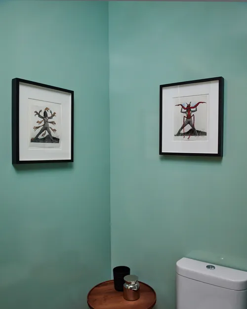 Raman waited eight years to buy her first work: Hounds of Hell (1973) by Mary Beth Edelson. “This is not the most obvious or conventional choice,” she said. Although Edelson was a pioneering feminist photographer, she’s less famous than other legends in Raman’s collection—like Tracy Emin, whose neon sculpture Keep Me Safe (2006) casts a glow over Hounds of Hell and another one of Edelson’s works in Raman’s powder room.