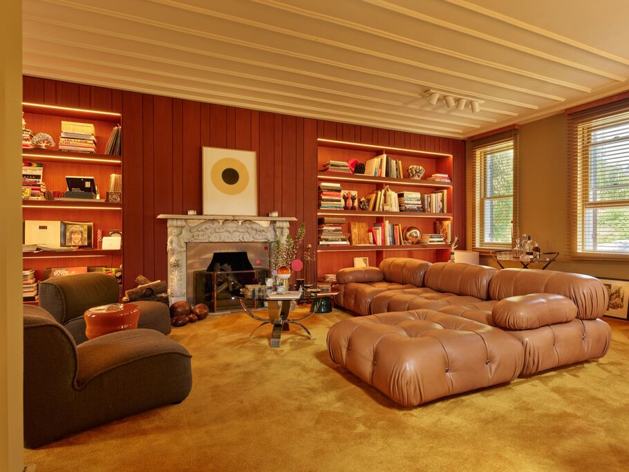 The sandy-hued tones, which hint at 1970s West Coast interiors, wash the dwelling with amber shades in furniture and carpeting. An Alexander Calder mobile rests on the coffee table, not so far from a ceramic sculpture by their close friend and collaborator José Parlá.