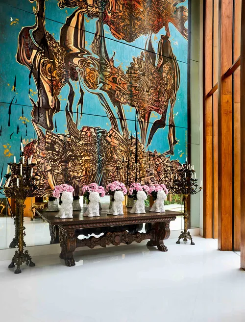 Passi’s South Delhi residence is both home and a living museum—she believes the artworks she acquires live and grow with her. In its cascading halls, she drifts down the staircase, often in vintage saris or Roberto Cavalli gowns, passing works by the likes of Anita Dube, Atul Dodiya, and Anish Kapoor. Here, contemporary art nestles comfortably alongside 17th- and 18th-century French and Italian furniture: a Baccarat Mille Nuits chandelier hovers above a Damien Hirst skull painting, a Hudson antique teak-root table rests on a circa-1900 Feraghan Mahal carpet, and a 19th-century Italian gilded mirror reflects S.H. Raza’s painting Germination (1995). A lacquered gilt chinoiserie chest coexists with Jeff Koons’ Puppy (Vases) (1998) and an Hervé van der Straeten “Passage” console. Across generations and geographies, what emerges is a collection that shows confidence in curiosity, built with thoughtfulness rather than a prescriptive vision.