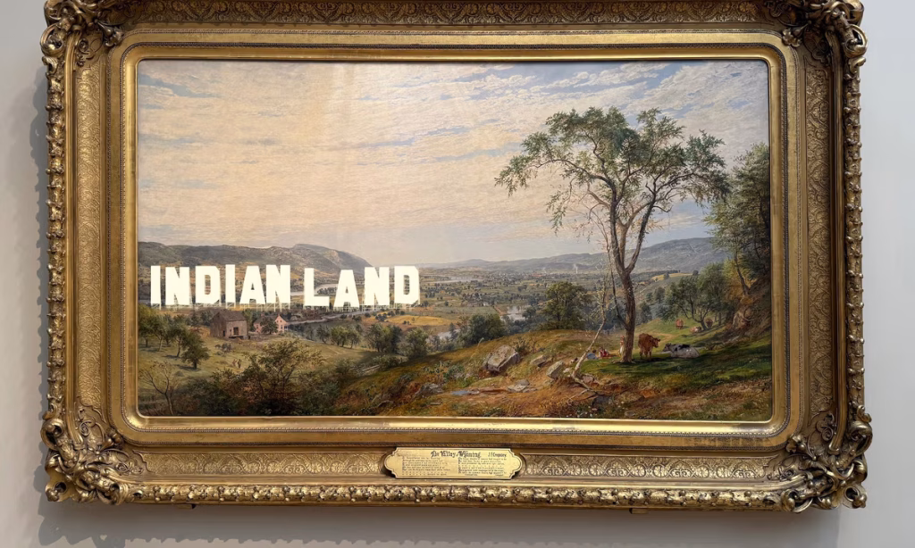Jeremy Dennis’s The White House (2025) digitally overlaid on Frederic Edwin Church’s The Parthenon (1871) at the Metropolitan Museum of Art Courtesy the artist and Amplifier