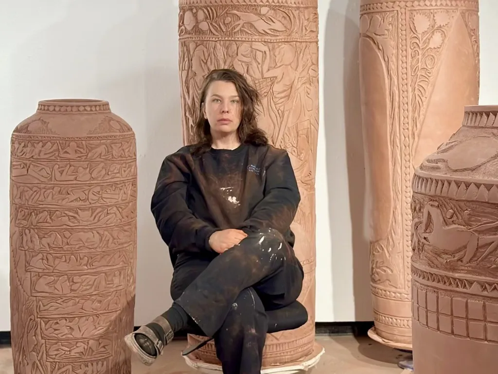 “Even though I worked alongside her for years, I don’t know how this young artist from Joshua Tree sgraffito’d mythologies onto stone as if she was beamed in from Pompeii A.D,” Nelson said. “She worked in divine, painful frenzies for days and weeks on end. Monuments emerged. Five-hundred-pound sculpture inlaid with obsessively, beautifully detailed linework and whole narratives. I was awed by her art and prodigy, but what I will miss most of all is our deep, silly friendship. Long conversations in her studio about the lonely, inspired life of artmaking. She was funny and relentless and made art of the gods.”