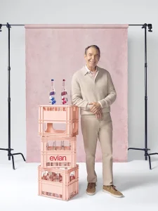 Evian also released a photoshoot featuring its brand ambassador to commemorate the 200th anniversary. In one image, Koons sits on a pink Evian crate, surrounded by Spanish tennis player Carlos Alcaraz, British tennis player Emma Raducanu, American tennis player Frances Tiafoe, and French golfer Céline Boutier. The setting is the French Alps, where the titular Evian spring is located.