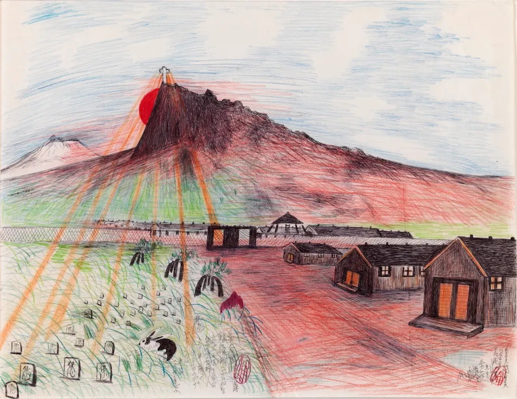 In their research, curators Kaneko and Ercums have also uncovered a major misconception about Mirikitani, that he was self-taught. Nearly all of his work created after the late ’90s, they argue show his training in Nihonga, a style developed in late 19th-century that sought to safeguard and modernize Japanese painting traditions just as the country was reopening to the West. In some of his most striking pieces, Buddhist imagery intertwines with his personal biography, strengthened by the training he received from Gyokudō, a master of landscapes, and Kimura Buzan, a specialist in Buddhist painting.