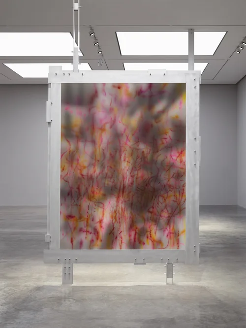 Exploring this human condition, the show features new bodies of work related to recent exhibitions at the Palazzo Grassi in Venice in 2024 and the Museum of Contemporary Art in Sydney in 2024 to ’25. It includes new examples from Mehretu’s “TRANSpaintings/Upright Brackets” (2024–26) series: ink and acrylic paintings on monofilament polyester mesh, a material that allows the artist to build the composition in layers and for light to shine through. Based on abstracted photographs from media coverage of geopolitical events, the colors and marks form ethereal shadows of their source imagery.