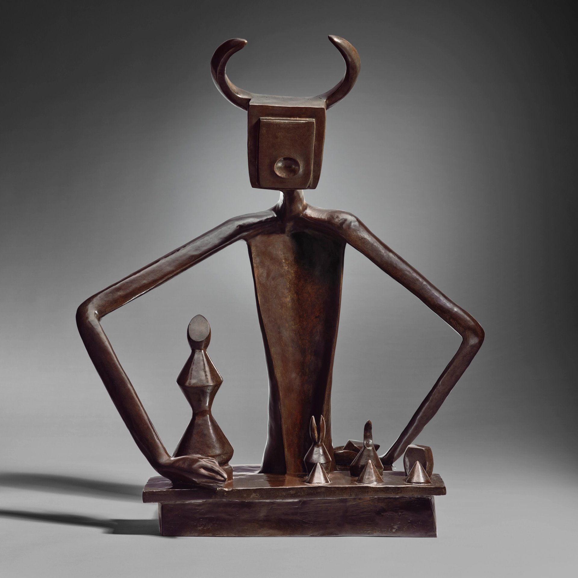 Of the three sculptures from the Weis collection, Max Ernst’s chocolate brown bronze, Le roi jouant avec la rein from a 1961 cast, reflective of the artist’s chess obsession and Surrealist roots, sold to the New York- and Las Vegas-based advisor Ralph DeLuca, who is also Sotheby’s vice-chairman of popular culture, for $17m ($20.1m with fees),