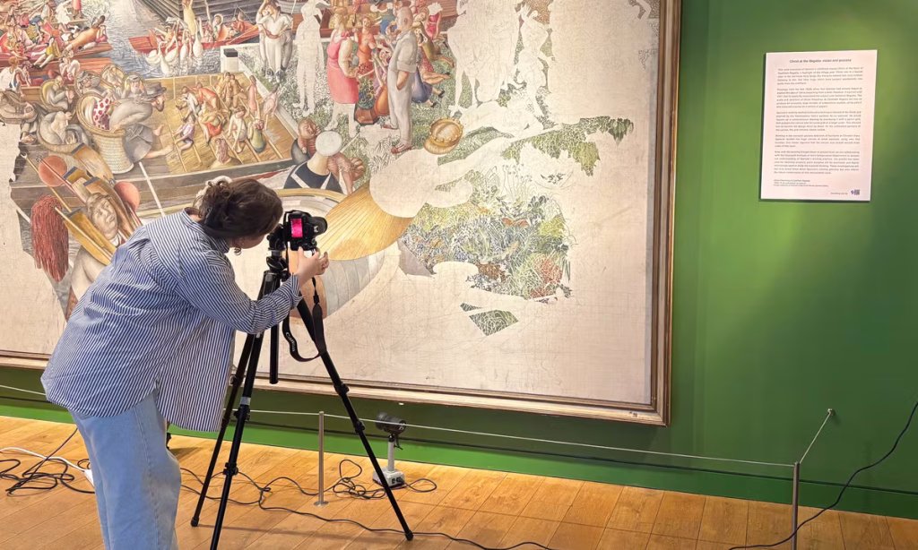 Ultra-violet (UV) light reveals “little pinpoint breaks” in the paint layer, which Leake believes are consistent with Spencer’s desire to finish the painting quickly, before he died. She feels similarly about the artist’s focus on the figure of Christ at the painting’s centre, which is one of just a few areas of the approximately two by five metres canvas that might be considered complete.