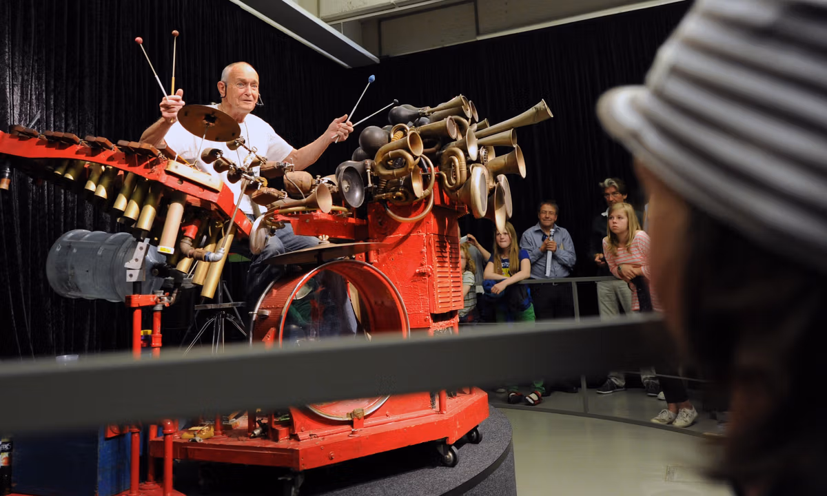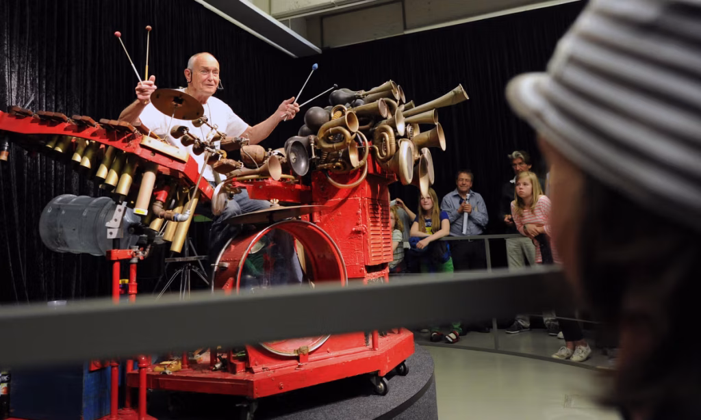 The 1970s also marked a period of musical experimentation for Foulkes. He played drums in a band called City Lights from 1965 to 1971, and founded his own project, the Rubber Band, in 1973. He also performed solo as “The Machine”, a one-man protest of America’s imperial overreach and corporate politics that he played on a large homemade contraption made of horns, percussive and xylophone elements. In 2004, he released an album of original songs called Llyn Foulkes and His Machine: Live at the Church of Art.