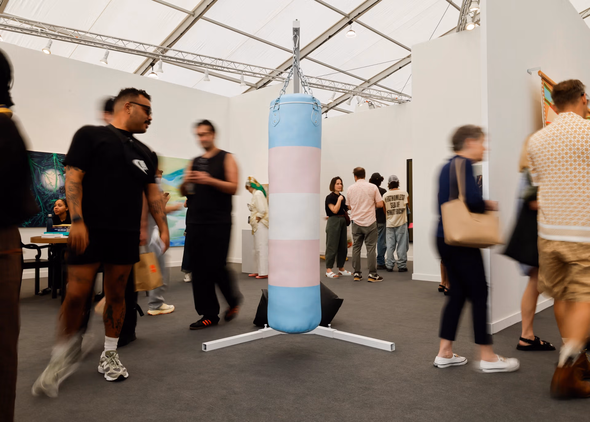 Puppies Puppies’s A metaphor for how I feel – my identity is being used – in 2026 (Punching Bag), on Hoffman Donahue’s stand, invokes the trans pride flag Carlin Stiehl