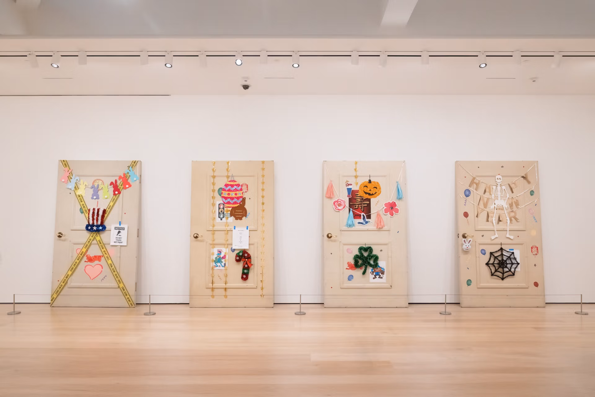 Humour can lighten up the grim present, and Amanda Ross-Ho’s Untitled Thresholds (FOUR SEASONS) (2025) has humour—and cultural mashups—in spades. Here, she has made four versions of her father’s door at his memory-care facility at twice their actual size, each decorated in a riotous array of holiday and consumer-culture trinkets. The doors lean against a wall, placed side by side, dwarfing the viewer with their pop-culture pastiche. On one, there are the words “Happy New Year” overlaid with a Halloween skeleton and, beneath that, a black spiderweb. Depictions of party balloons are scattered throughout.