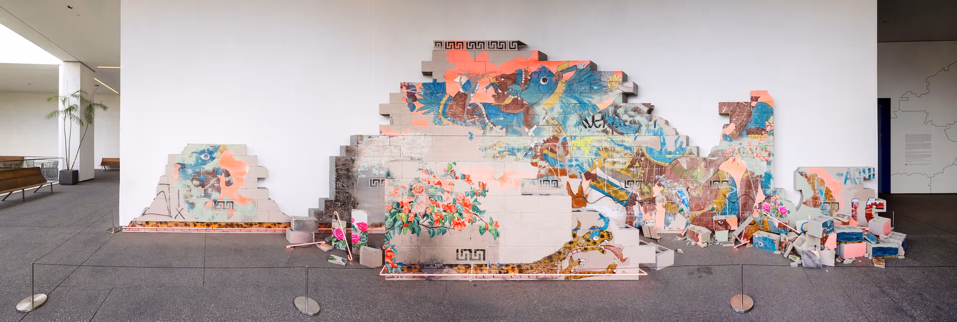 More foreboding but no less colourful is a neon sign hung near the ceiling as visitors enter one of the main galleries—it reads: “Agua Is Life; NO ICE”. It is the work of the Pasadena-born artist Patrick Martinez, who also has a large installation along an exterior corridor. Battle of the City on Fire (2025) is a partly collapsed cinder-block wall painted with graffiti. “I’m always thinking about the people and energy that shape Los Angeles’s different surfaces when I drive or ride my bike,” Martinez says of the piece.