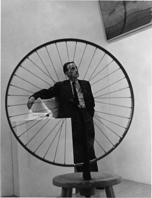 Many of the originals were produced in the 1910s but had been lost or destroyed in years past, including Fountain (1964, after 1917 lost original), L.H.O.O.Q. (1964, after 1919 original), Porte-bouteilles (Bottle Dryer) (1964, after 1914 lost original), and Boîte-en-valise (1935–49; contents 1935–41). Also included in the show is Roue de bicyclette (Bicycle Wheel) (1964, after 1913 lost original), which is the only surviving example of these works that does not belong to a major international institution.