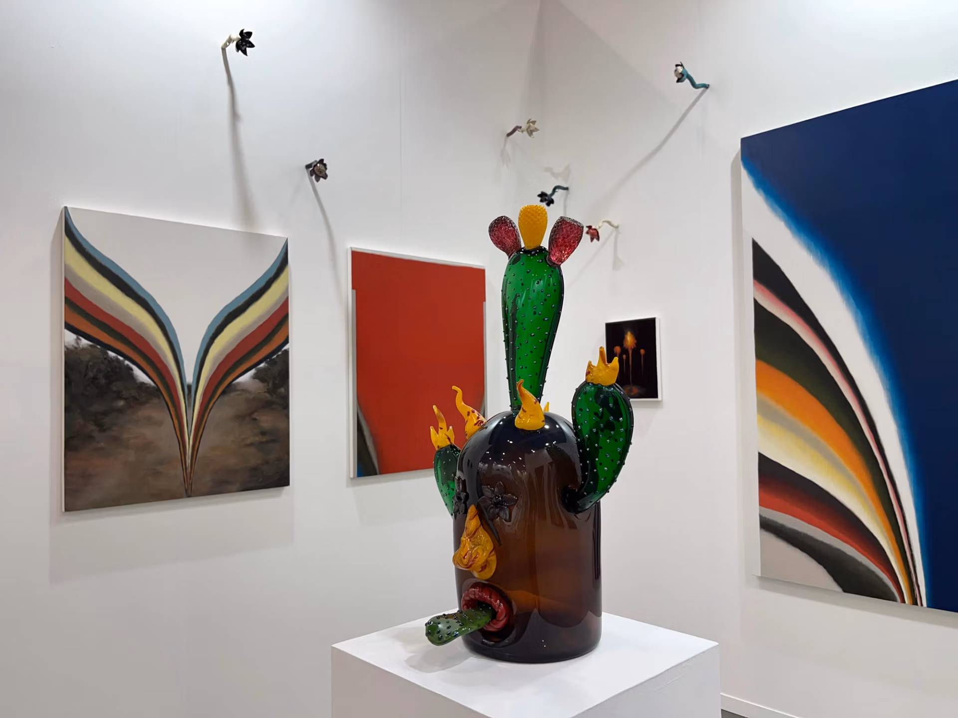 The New York-based gallery Kates-Ferri Projects is presenting a three-artist stand, anchored by the Mexican artist Salvador Jimenez Flores’s blown-glass sculpture of a cactus-like bust (or bust-like cactus). His work is flanked by paintings by the Venezuelan artist Luis Figueroa and, above them, sculptural ceramic weeds by the Pakistani artist Noormah Jamal, each of which encloses a tiny head in place of a flower. Natalie Kates, the gallery’s co-founder, describes the curatorial theme as “nature run amok”.