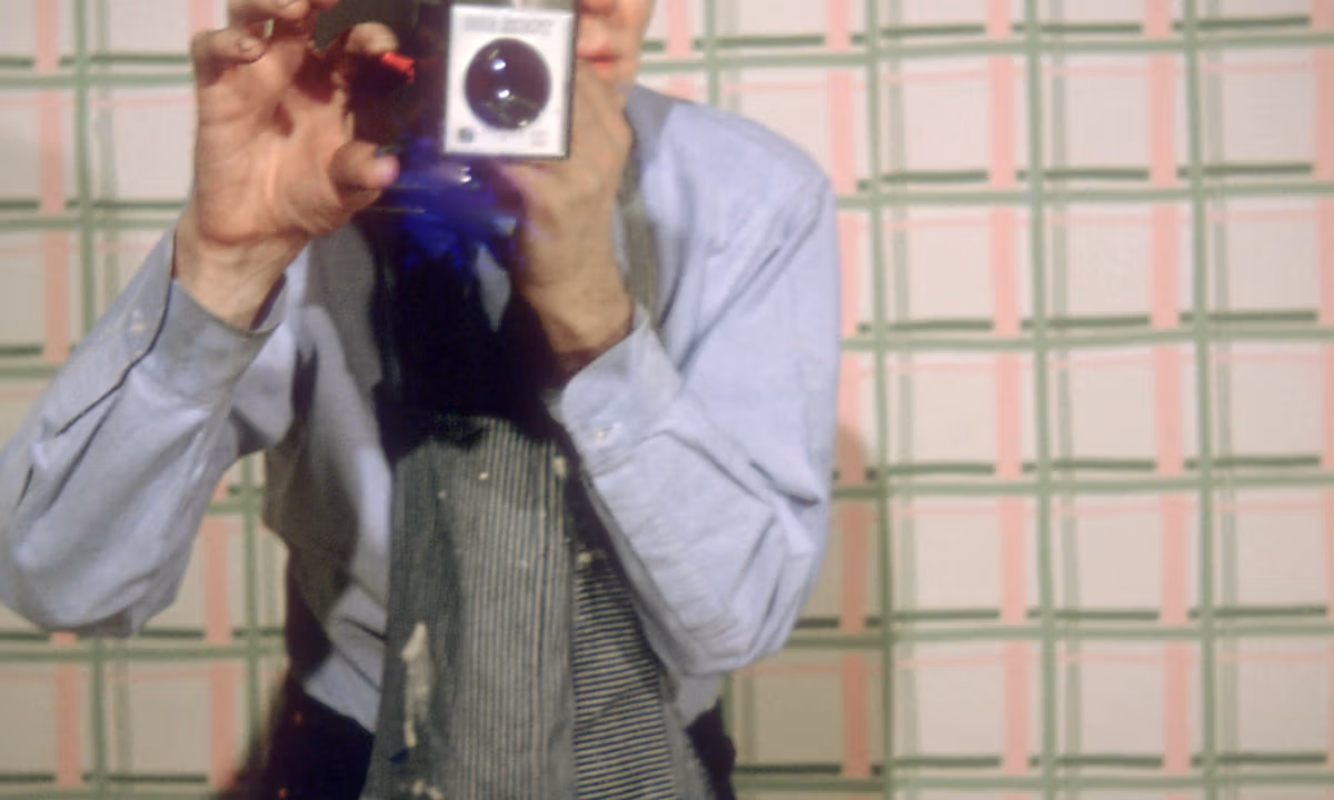 Andy Warhol in an apron with his Big Shot Polaroid camera in the Factory (1970s) by Ronnie Cutrone