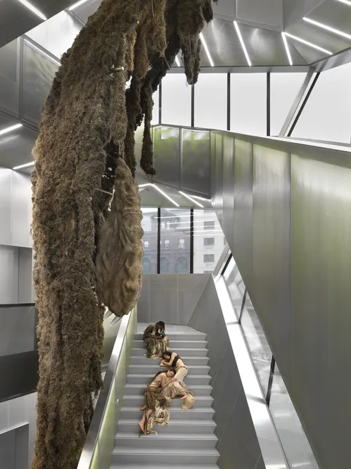Hosnedlová’s Shelter (2026), a monumental multi-media installation, fills the atrium stairwell, while Art Lovers (2025), a cast aluminum sculpture by Tschabalala Self of an intertwined couple, adorns the museum’s facade where the OMA and SANAA buildings meet. A new installation by Sarah Lucas is forthcoming.
