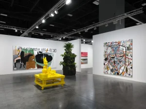 Kalenderian’s project was proposed specifically for Nada Miami, according to the gallerist Chris Henke, and the gallery has also produced custom-embroidered hats that the fair is selling at its merchandise booth. The $55,000 painting had already sold to a New York-based client prior to the fair’s VIP opening, as many interested locals learned on inquiring.