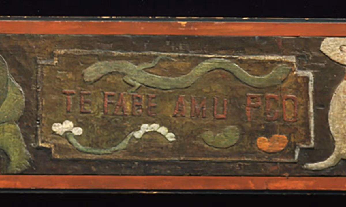Carved in a rough style on sequoia wood, and nearly 1.5m wide, the text “TE FARE AMU” is followed by “PGO”, an abbreviation for Paul Gauguin. The artist enjoyed the fact that in French these letters would be pronounced “pego”, a slang word for penis.