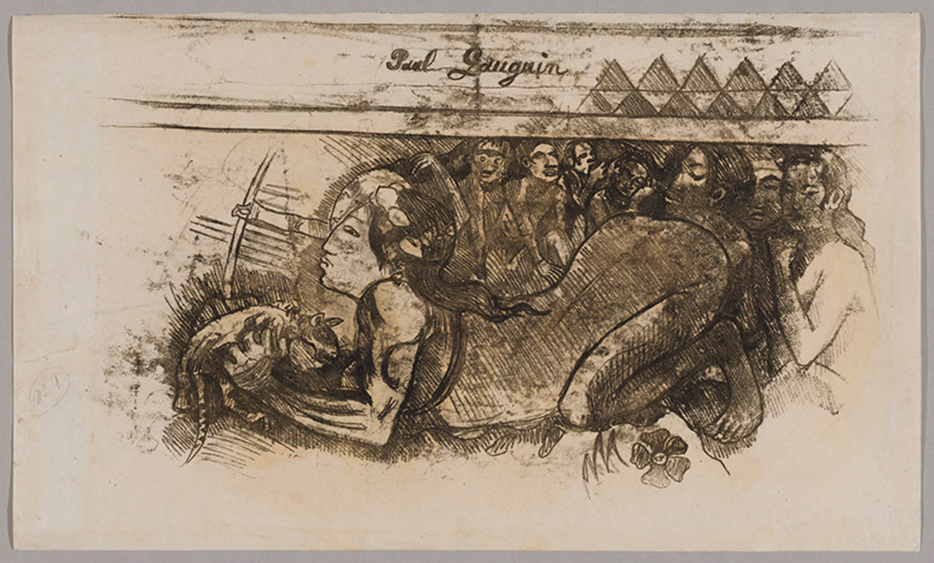 Some Gauguin specialists have suggested that the crouching woman was inspired by Polynesian sculpture. A rare example of this subject survives at the British Museum, where the wood carving of a naked figure (probably Hawaiian but possibly Tahitian) is described as a device to serve as a stand for holding a spear or a fishing rod. The image of a crouching woman also appears, once again with a serpent, in a Gauguin drawing: the sphinx-like Polynesian female in Woman with a Cat (around 1900), which is now at the Art Institute of Chicago.