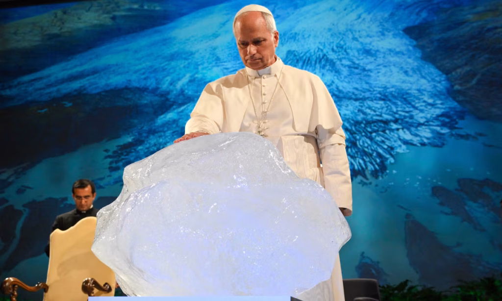 The 20,000-year-old melting piece of Greenlandic glacial ice travelled more than 5,000 kilometres from the fjords of Nuuk, Greenland to the Raising Hope for Climate Justice conference, where it was touched by the pontiff during his inaugural address (1 October).
