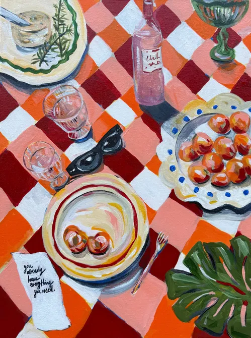 As spring approaches and my focus shifts toward hosting at home, this contemporary still life by Larica Schnell feels like an image from my 2026 Pinterest board. With its tapered candles, champagne saucers, and coquette-style ribbons, the lavish tablescape is the epitome of the hyper-feminine dinner party aesthetic. Schnell’s vibrant acrylic brushstrokes capture the ambience of an evening with friends.