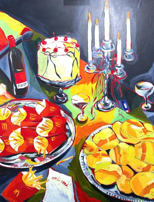 The carefully curated table is both celebratory and aspirational, mirroring the tone of its title, A Feast for Dames. Within this scene, Schnell nods to a culture of overconsumption, depicting McDonald’s fries and glasses of Pinot Noir; she juxtaposes the elegance of a formal dinner with the mundanity of fast food. The central imagery of a cake, adorned with red cherries and playful ribbons, feels very symbolic. It serves as a critique of excess, bringing to mind the famous quote, “let them eat cake.”