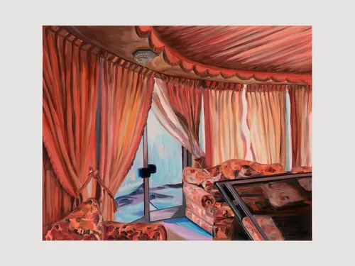 Nothing is alive in Study for illusion never changed (2023) except, perhaps, the room itself. In Anna Freeman Bentley’s oil-on-paper work, the scene is devoid of people, but not of motion and warmth. The room itself becomes the protagonist: pink, fleshy, and inscrutable.