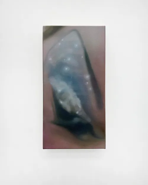 I have a soft spot for small works. I love their intimacy, the way they demand you look closely. Nicolina Morra’s reverie in blue (pink flamingos) (2025) hooked me first with its verticality: the canvas is so narrow that the eye at its center seems squeezed into the frame, distorted by the pressure of its own constraints. The title suggests that the image is drawn from John Waters’s 1972 film Pink Flamingos, likely a close-up on its star, Divine. This adds layers of camp, audacity, and transgressive glamour to the painting. Even taken out of context, Divine’s eye is pretty and unsettling in equal measure—bedecked in glittery pale blue eyeshadow, almost Cinderella-like, with a dramatically arched brow that reads as both a cosmetic choice and a kind of defiance. There’s something here about beauty and conformity, about performance and control. The palette is dreamy; the cropping is severe. I could look at this painting 10 different times and always find something new to say about it.