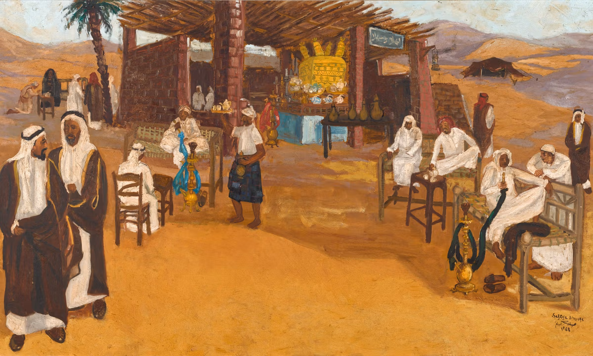 Coffee Shop in Madina Road (1968; est. $150,000-$200,000) by Safeya Binzagr, dubbed the “spiritual mother of contemporary Saudi art”, comes from the collection of Alberto Mestas García, the Ambassador of Spain to the Kingdom of Saudi Arabia from October 1966 to May 1976, and his wife, Mercedes Suárez de Tangil Guzmán. A work by another key Saudi artist, Mohammed Al Saleem, is a prime example of Horizonism, an abstract style inspired by the shifting sands of Riyadh (Untitled, 1989; est. $150,000-$200,000).