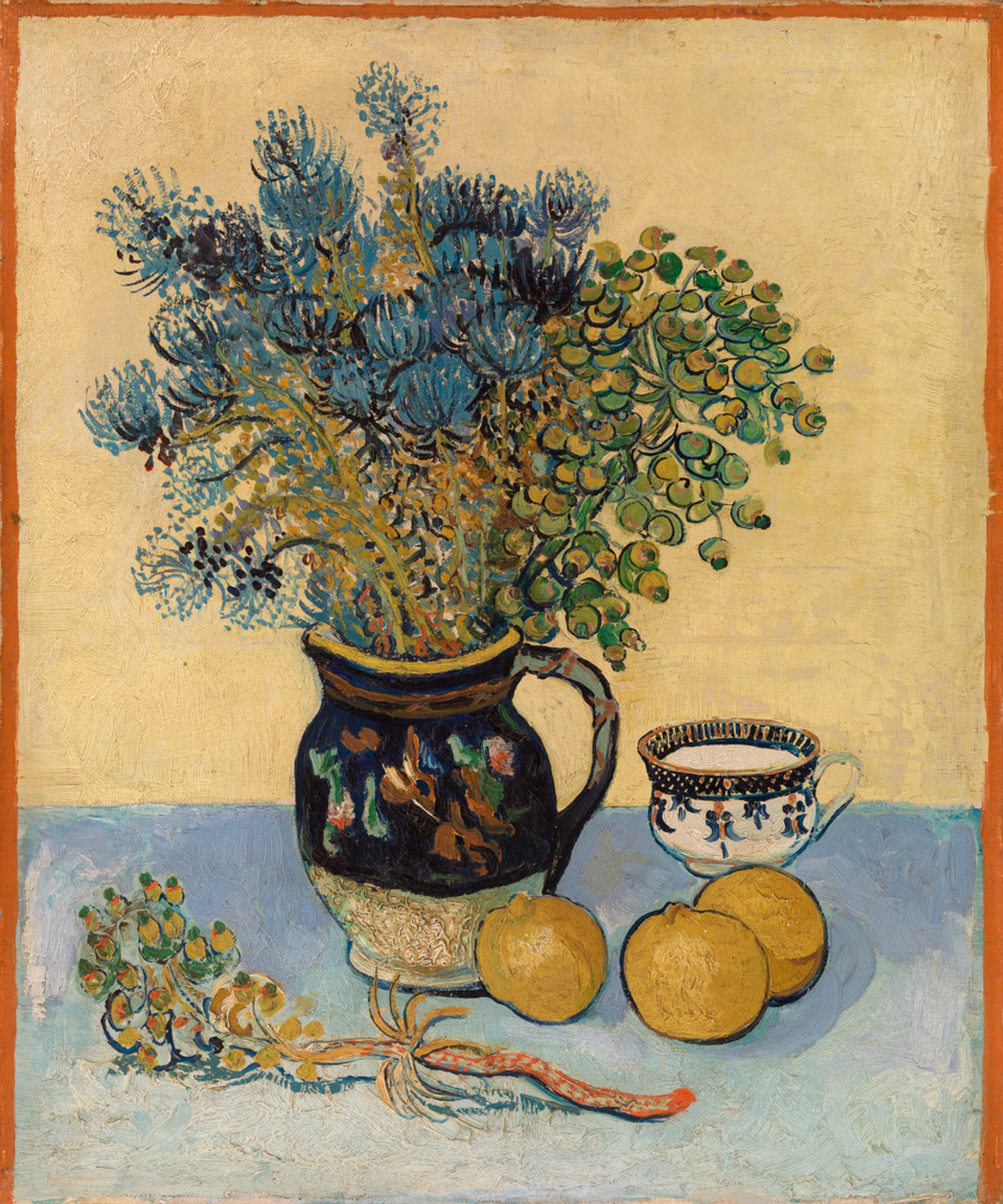 Still Life (May 1888) depicts flowers in a blue majolica vase. They were presumably picked on a springtime walk in the surrounding countryside outside Arles. It was a precursor to the Sunflowers, which he painted three months later. Van Gogh had added a red painted border around the top and sides of the Barnes composition.