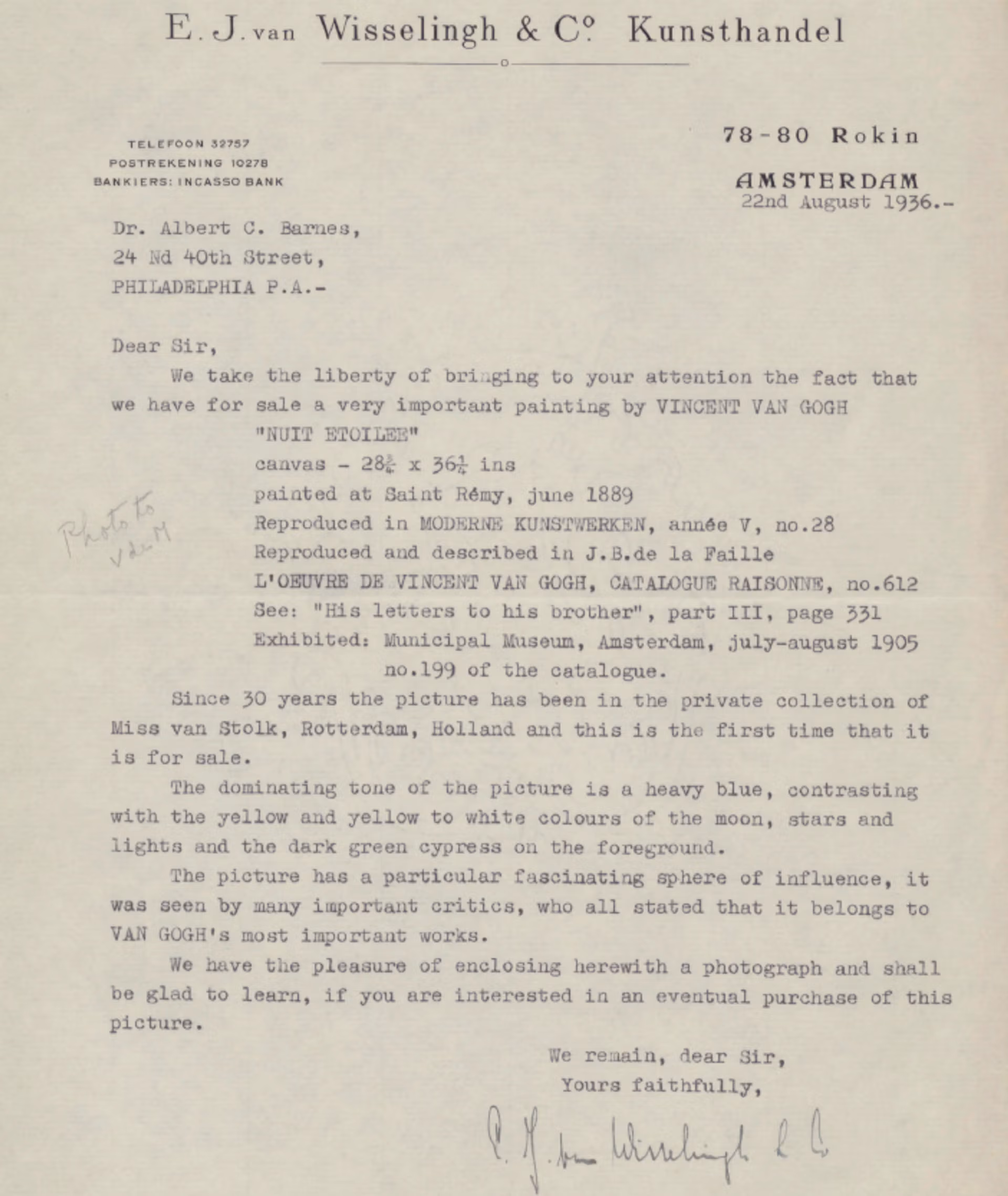 Barnes later had the chance to acquire another Van Gogh nocturnal scene. In 1936, the Van Wisselingh gallery in Amsterdam wrote to Barnes, to “take the liberty of bringing to your attention” the fact that Starry Night was available for sale. They explained that the painting had been in a Rotterdam private collection for 30 years and enclosed a black-and-white photograph.