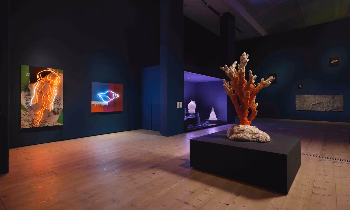 In between, the show encompasses multifarious ocean habitats and marine ecosystems from near shore and intertidal zones to coral reefs, the open sea and underwater terrains. Joan Jonas offers an exuberant tribute to the biodiversity, intelligence and complex ecologies of ocean life with Moving Off The Land II (2019), an installation of drawings and films; while Taloi Havini and Michael Toisuta’s videos explore the regeneration of coral reefs at night through mass-coral spawning. Less celebratory is Shezad Dawood’s examination using neon, sculpture and commercial beach towels to address the consequences of both climate change and global beach tourism on marine ecosystems; while Otobong Nkanga—in her enormous, richly detailed woven tapestry of a subaquatic landscape, in which severed limbs and mechanical forms are integrated with luxuriant plant and coral life—offers a stark reminder of the fraught and complicated histories of extraction and displacement that are now indelibly associated with the world’s oceans.