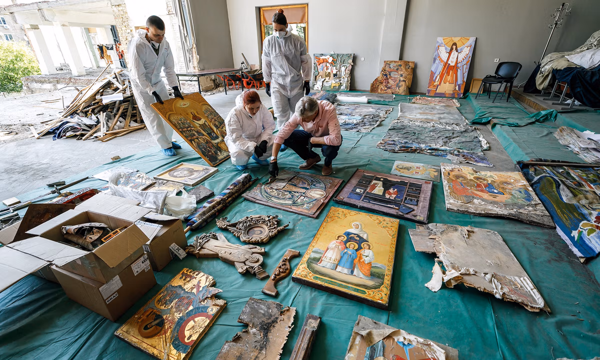 Workers assess a damaged painting recovered from the bombed Boychuk Academy