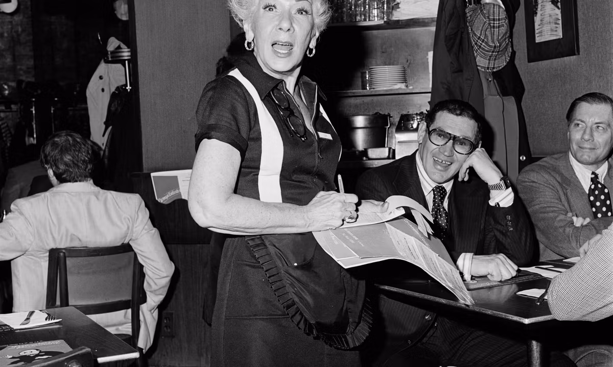 A photo of Lisette Model herself at Brassai’s Marlborough Gallery opening in New York by Rosalind Fox Solomon (1976) © Rosalind Fox Solomon / MUUS Collection