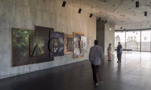 One of LACMA’s earliest acquisitions, Diego Rivera’s Flower Day, introduces visitors to a wide selection of objects by Indigenous artists from across the Americas and 20th-century works by Latin American artists who integrated early mythologies into their portrayals of modern subjects. In the earth-toned oil painting, a flower vendor obscured beneath a massive basket of paper-white calla lilies bows before two kneeling women. Rendered in block-like volumes, the figures recall Mesoamerican sculptures, such as Goddess with Temple Headdress (1325-1521), on view nearby. The calla lilies themselves are transoceanic: native to southern Africa, the flowers arrived in Mexico by way of European trade routes and were so thoroughly absorbed into the country’s visual culture that they became an emblem of Indigenous identity. Sharon Takeda, head of the departments of costume and textiles and Japanese art, says the building’s poured grey concrete walls can alter the perception of both the pigments and compositions. “You look inward,” she says, “instead of toward the outline or the frame, which entirely changes its appearance.”