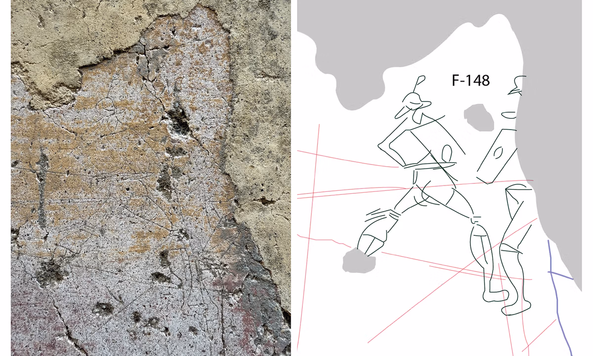 The discoveries also include a faint sketch of two fighting gladiators, one of whom leans backwards in a feint or parry pose while holding his pointed sword horizontally in a bent arm.