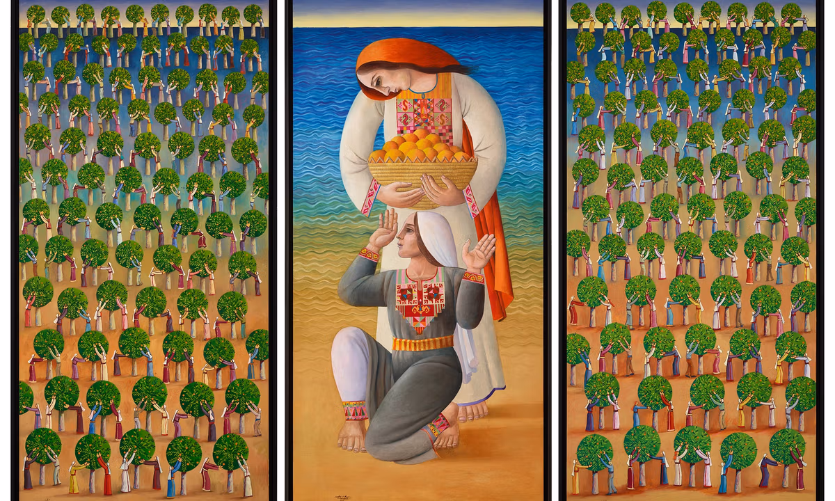 The painter Sliman Mansour (born 1947) is featured among the visual artists who grew up under Israeli censorship, which prevented them from forming an artists’ union and from depicting nationalist symbols, including references to the Palestinian flag. Mansour turned instead to an idyll of rural life. Tatreez embroidery provided a strikingly enigmatic source of visual interest, mimicking the bold, angular lines of Mansour’s figures and landscape. While some of his works have even incorporated mud, adding an earthy feel to the play of textures and tones, he has depicted textiles with an anthropologist’s eye for detail, preserving the subtle differences, now lost, between embroidery from Gaza, Hebron and Ramallah. But since then, “they lost their accent”, he writes, and the “embroidery is the same”.