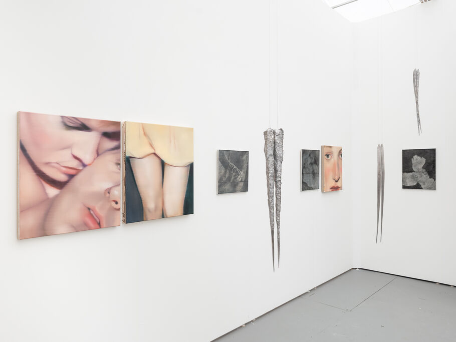 They’re grouped with frenetic abstract paintings by Lola Stong-Brett, including At Night I Sit and Beg for You (2025) on the back wall, where wild gestural marks churn across the canvas. Nearby, more intimate figurative works introduce a different tension: Laura Footes’s Anxious Bathers (2025), showing a mass of scarlet bodies, and Vanessa Raw’s Step Into the Magic We Know (2025), depicting two nude women kissing in a forest. It’s a booth that meets visitors head-on with bold images that are impossible to ignore.